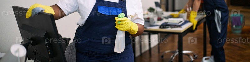Молодая чернокожая женщина убирает компьютерный монитор в современной офисной среде