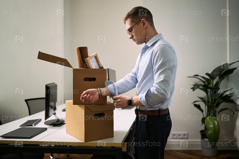 Молодой кавказский мужчина упаковывает канцелярские принадлежности в картонные коробки во время уборки