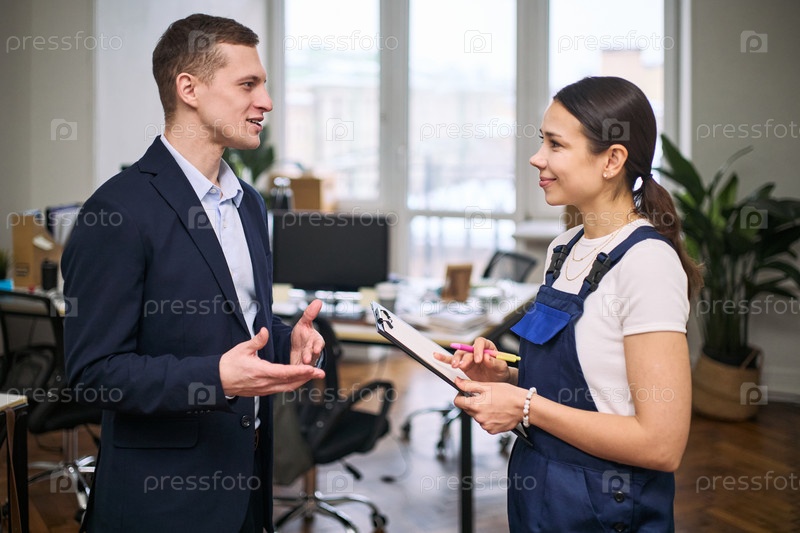 Кавказский молодой человек разговаривает с юной женщиной уборщица обсуждает офисную чистку