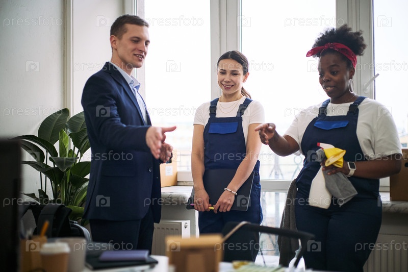 Кавказский молодой взрослый мужчина объясняет инструкции по уборке мультиэтническим женщинам