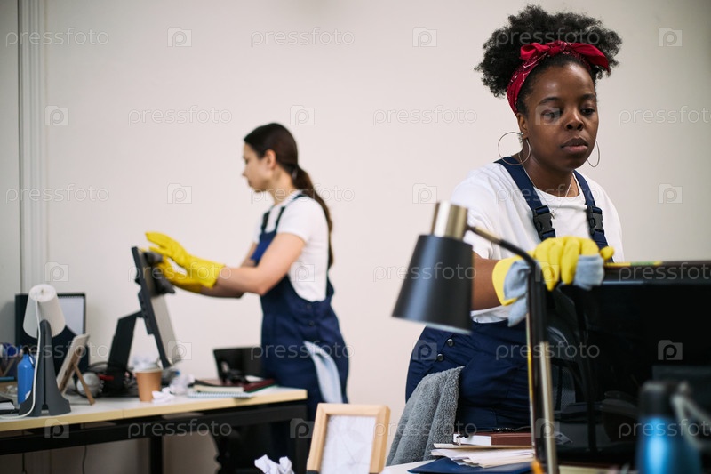 Молодая взрослая черная женщина и молодая взрослая белая женщина Уборка офисного рабочего пространства