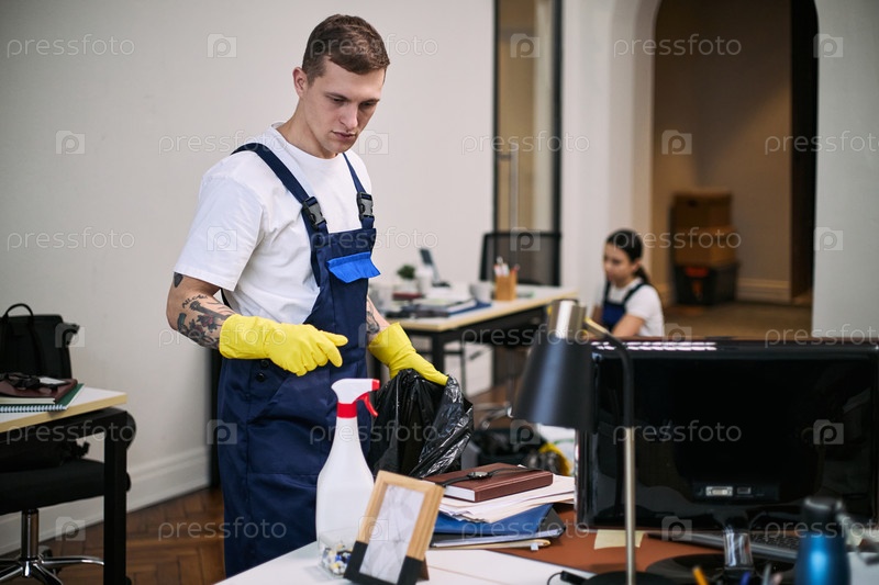 Молодой белый мужчина убирает офисный стол с спрейной бутылкой и мусорным мешком