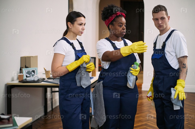 Мультиэтнические молодые взрослые уборщики обсуждают совместные задачи по очистке офиса