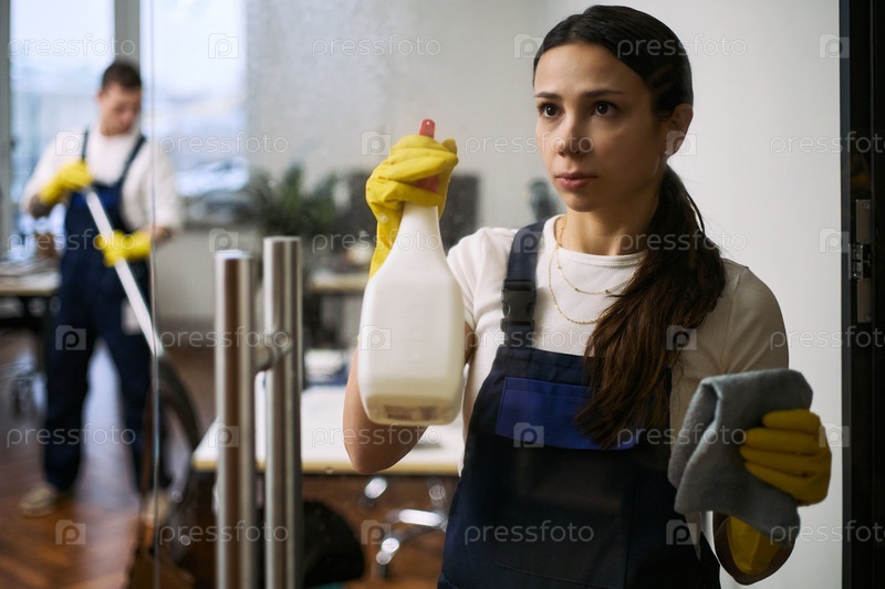 Молодая кавказская женщина убирает стеклянные двери офиса, в то время как коллега-мужчина чистит пол