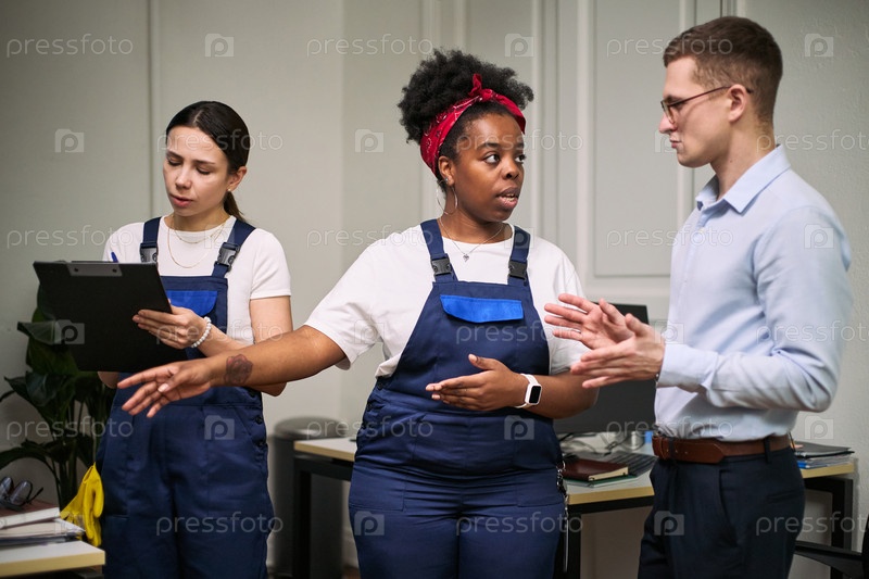 Молодой белый мужчина обсуждает задачи по уборке с двумя молодыми женщинами-уборщицами
