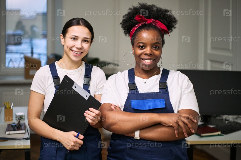 Молодая взрослая белая женщина и молодая взрослая черная женщина улыбаются в униформе офисной уборки