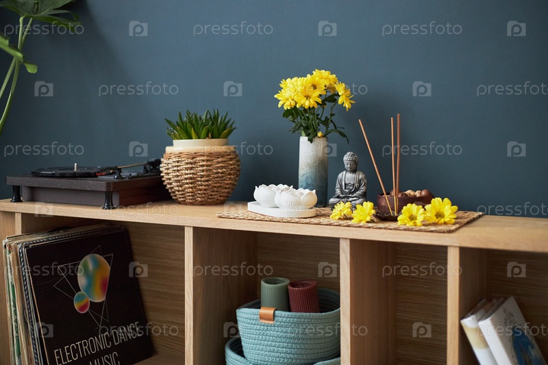 Статуя Будды с фимиамом и цветами, представляющими азиатскую культурную традицию