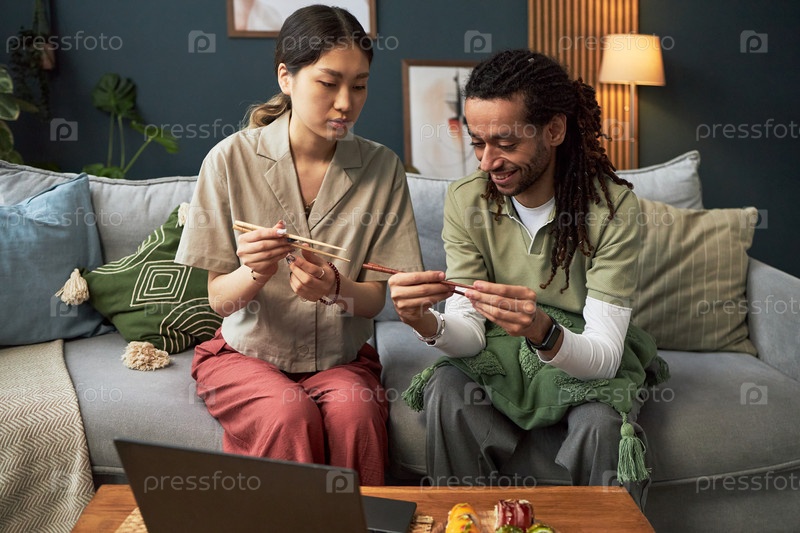 Молодая азиатская женщина учит молодого чернокожего мужчину использовать палочки во время онлайн-урока