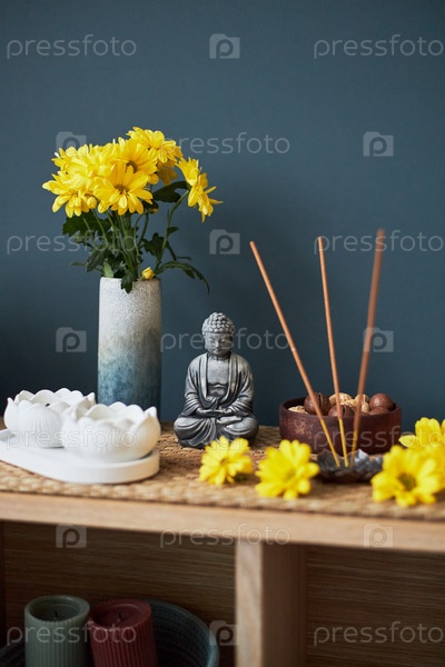 Буддийский алтарь, на котором изображены фимиамные палочки и цветы в честь азиатской культуры