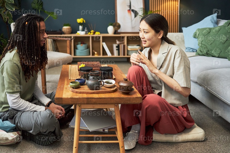 Молодая азиатская женщина делится традиционной чайной церемонией с молодым человеком в помещении