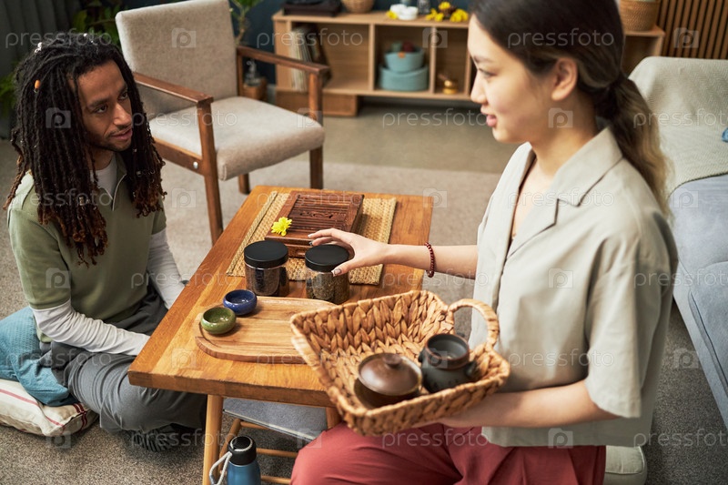 Молодая азиатская женщина готовит чай для молодого чернокожего мужчины во время культурного собрания