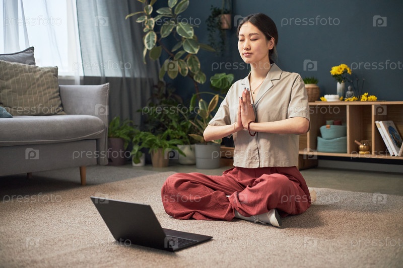 Молодая взрослая азиатская женщина медитирует в положении лотоса во время просмотра онлайн-класса