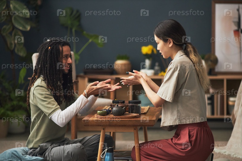 Азиатская женщина и молодой чернокожий мужчина практикуют традиционную чайную церемонию