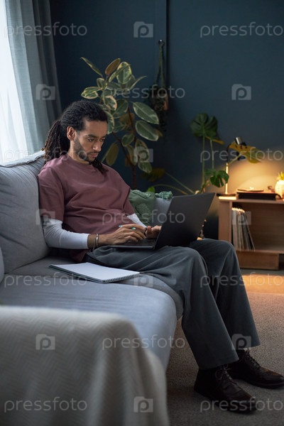 Молодой взрослый чернокожий мужчина сидит в помещении, используя ноутбук для удаленной работы