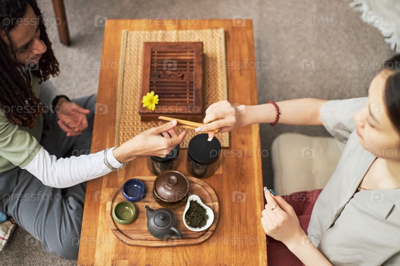 Молодая азиатская женщина и молодой чернокожий мужчина участвуют в традиционной чайной церемонии