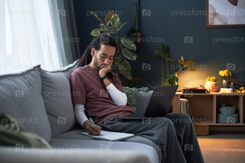 Молодой взрослый азиатский мужчина сидит на диване, работает удаленно с ноутбуком дома