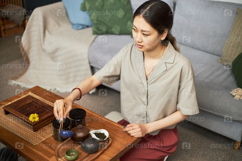 Молодая взрослая азиатская женщина готовит традиционную чайную церемонию в помещении