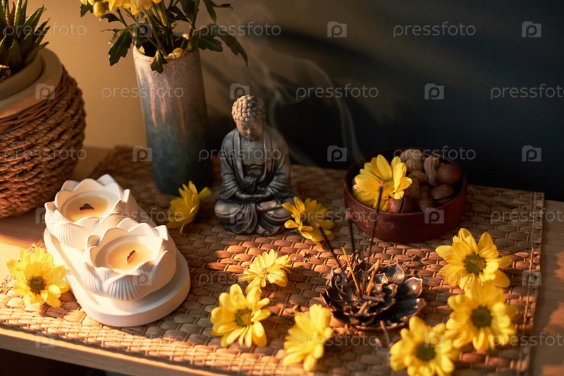 Статуя Будды в окружении горящего ладана и желтых цветов на столе