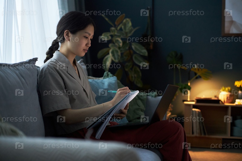 Молодая взрослая азиатская женщина изучает с помощью ноутбука, сидя на диване в помещении