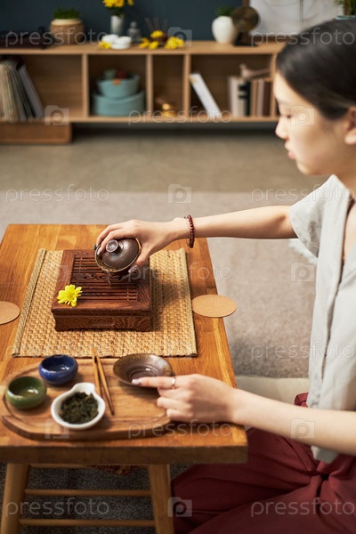 Молодая взрослая азиатская женщина наливает горячую воду на чайные листья во время культурного ритуала