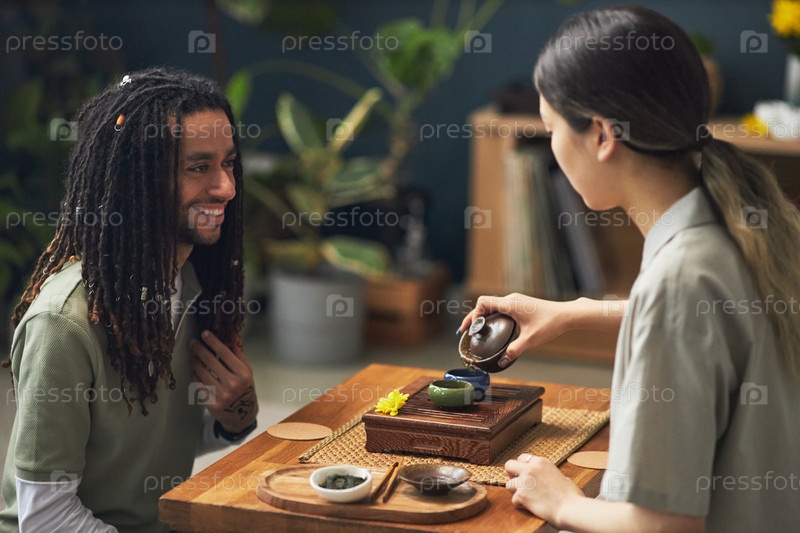 Молодая азиатская женщина выполняет традиционную чайную церемонию для молодого чернокожего мужчины