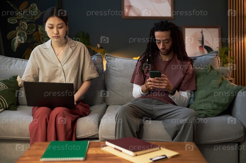 Молодая азиатская женщина использует ноутбук и молодой чернокожий мужчина отправляет текстовые сообщения на смартфон в помещении