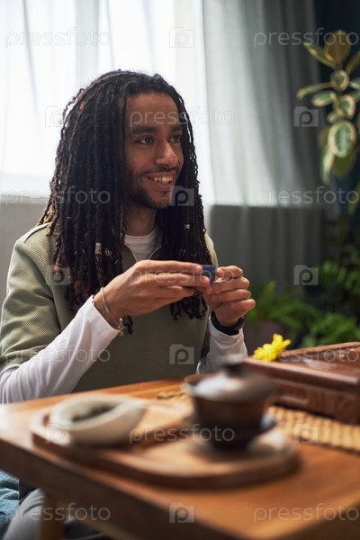 Молодой взрослый чернокожий мужчина наслаждается традиционной азиатской чайной церемонией в помещении