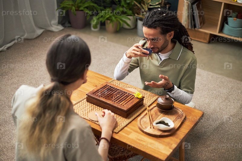 Молодая азиатская женщина и молодой чернокожий мужчина наслаждаются традиционной чайной церемонией в помещении