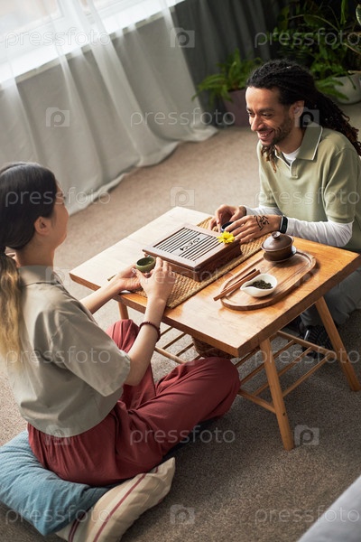 Молодая азиатская женщина и молодой чернокожий мужчина играют в традиционную настольную игру внутри дома
