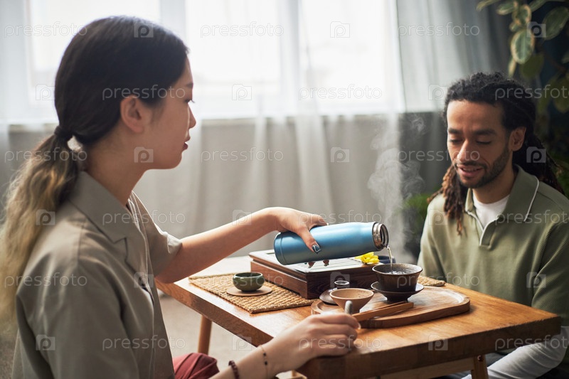 Молодая азиатская женщина наливает чай молодому чернокожему мужчине во время культурного собрания