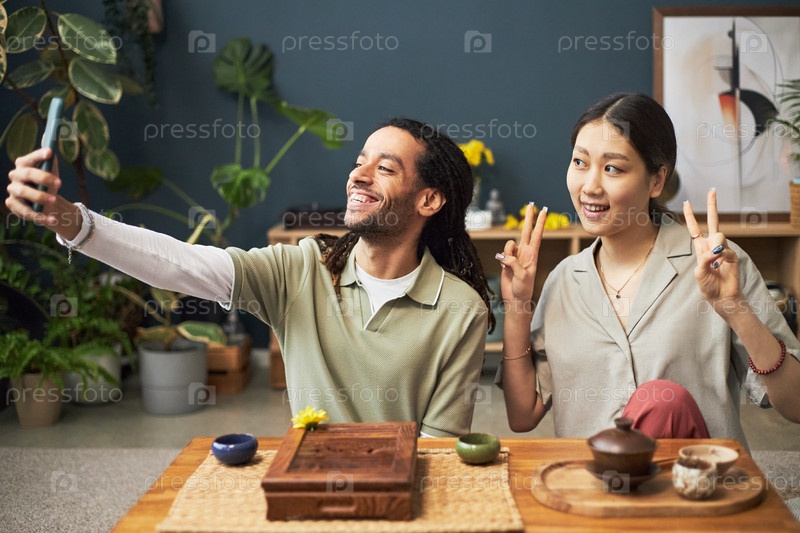 Молодая азиатская женщина и молодой чернокожий мужчина делают селфи и жестикулируют знак мира