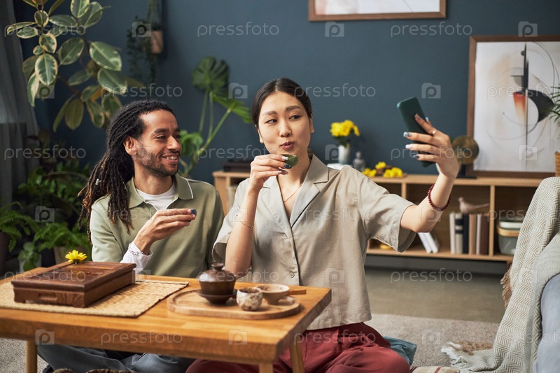 Молодая азиатская женщина делает селфи, выпивая чай с молодым чернокожим мужчиной