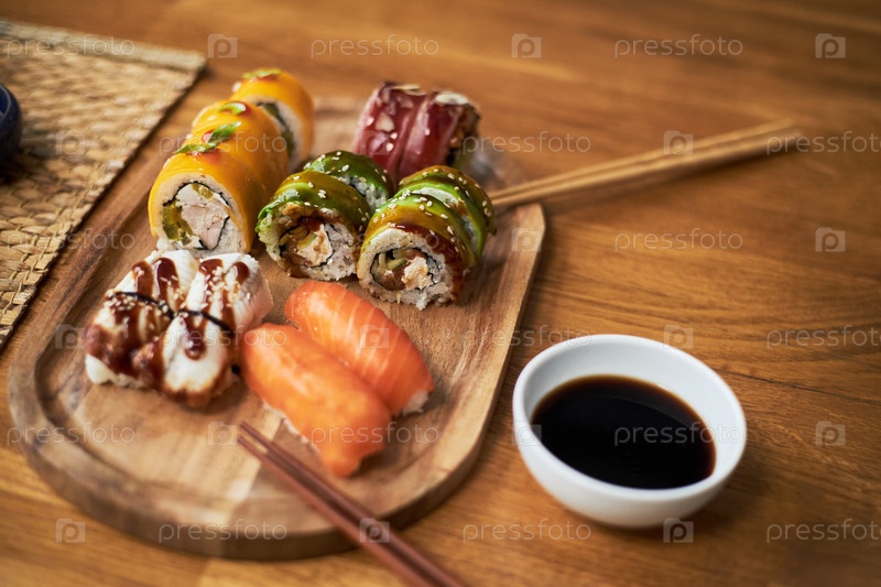 Традиционные азиатские рулоны суши и нигири, подаваемые с соевым соусом на деревянном столе