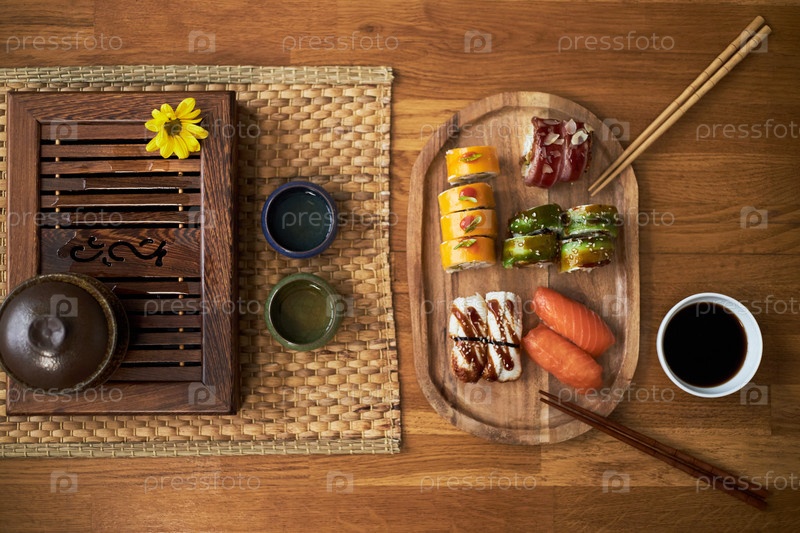 Традиционная азиатская кухня с суши-роллами и чаем на деревянном столе