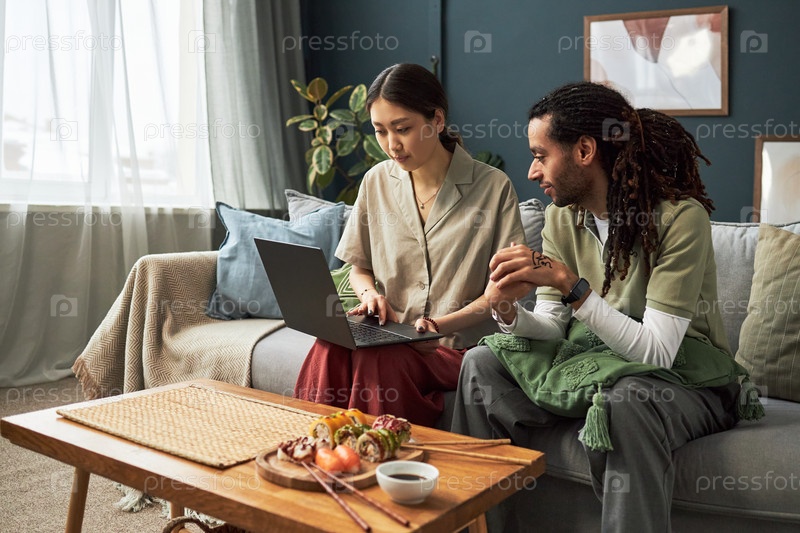 Молодая азиатская женщина и молодой чернокожий мужчина сотрудничают на ноутбуке в гостиной