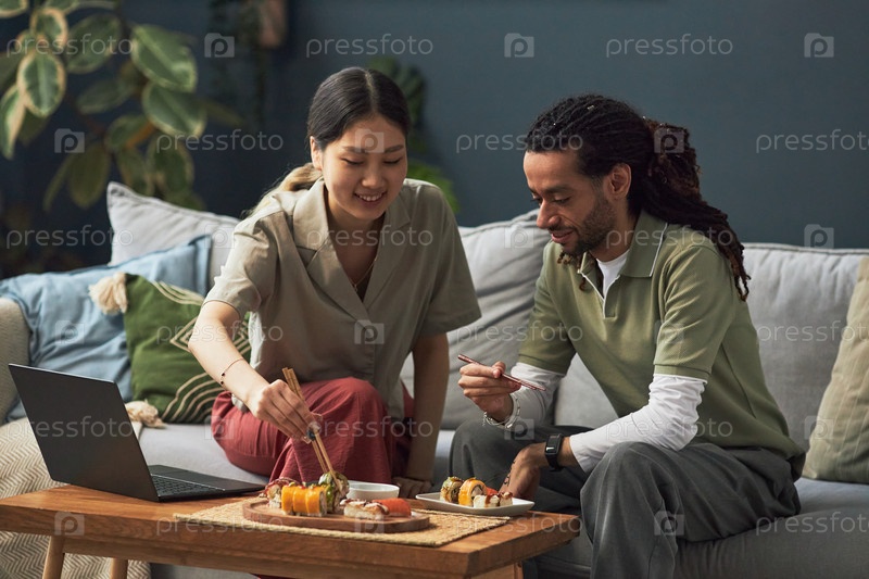 Молодая азиатская женщина и молодой чернокожий мужчина делятся суши и используют ноутбук вместе