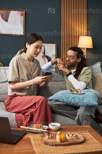 Молодая азиатская женщина показывает смартфон молодому мультиэтническому мужчине, сидящему в помещении