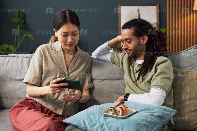 Молодая азиатская женщина показывает смартфон молодому чернокожему мужчине во время отдыха в помещении
