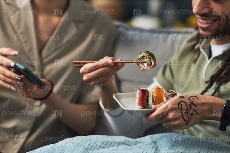 Молодая азиатская женщина и молодой мужчина едят суши вместе, используя палочки