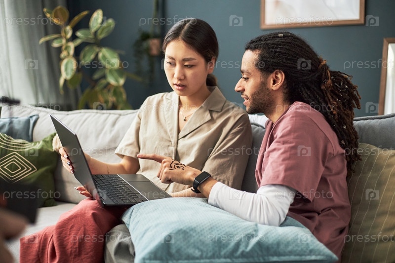 Молодая азиатская женщина и молодой чернокожий мужчина сотрудничают с помощью ноутбука в помещении