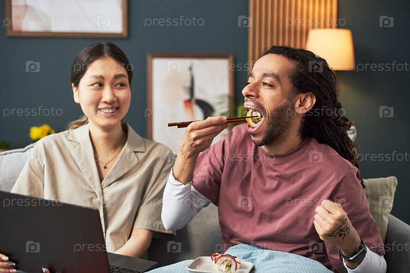 Молодая азиатская женщина и молодой мужчина наслаждаются суши вместе в современной гостиной