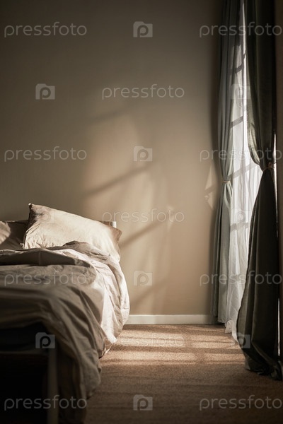 Пустая спальня купается в утреннем солнечном свете, передавая спокойные эмоции