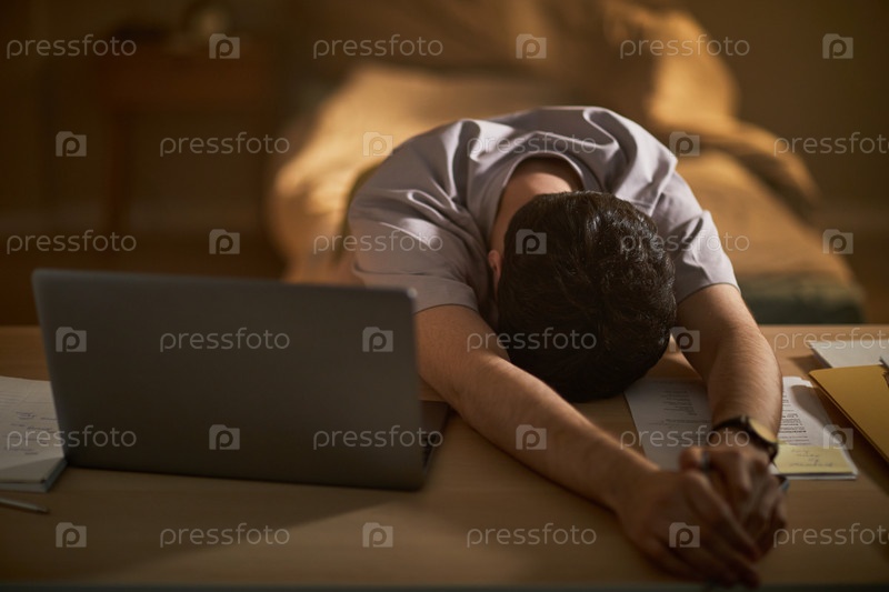 Молодой взрослый белый мужчина сидит за рабочим столом, чувствуя себя подавленным и истощенным