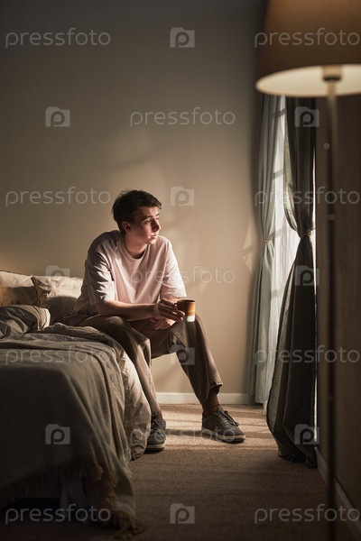 Молодой белый мужчина сидит на кровати, отражая в то время как держит чашку кофе внутри