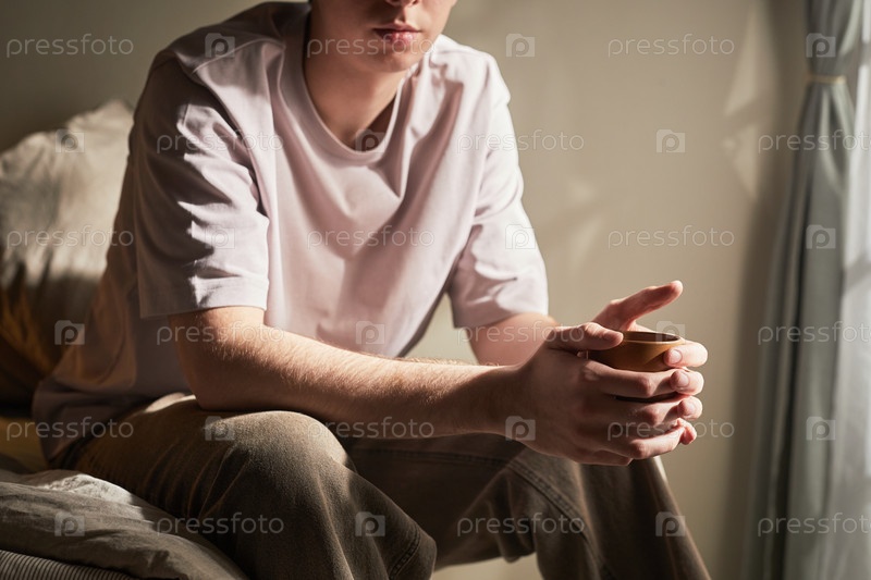 Молодой белый мужчина сидит в помещении и размышляет, держа чашку кофе