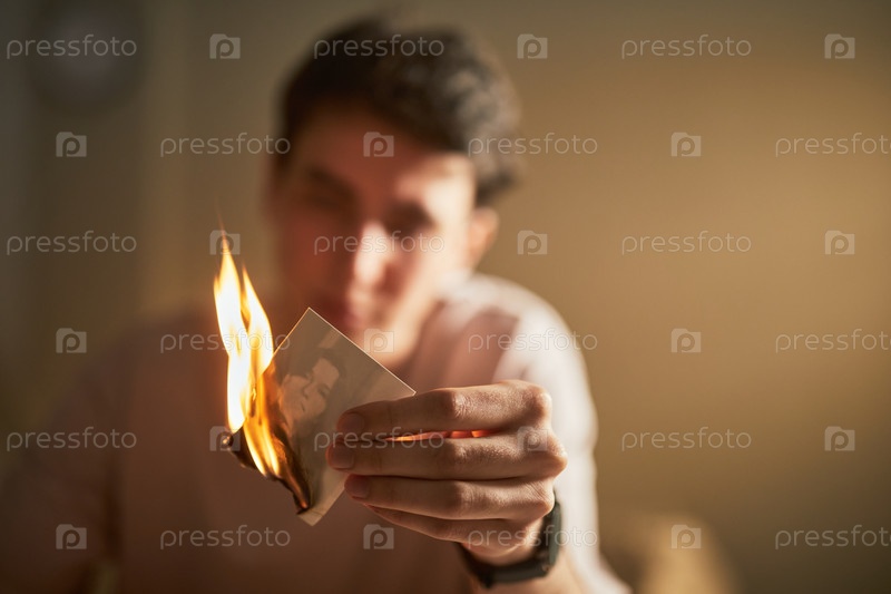 Молодой белый мужчина сжигает фотографию, выражая интенсивные эмоции