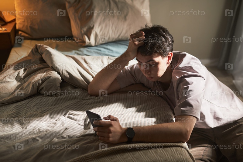 Молодой белый мужчина сидит на кровати, чувствуя беспокойство во время просмотра смартфона