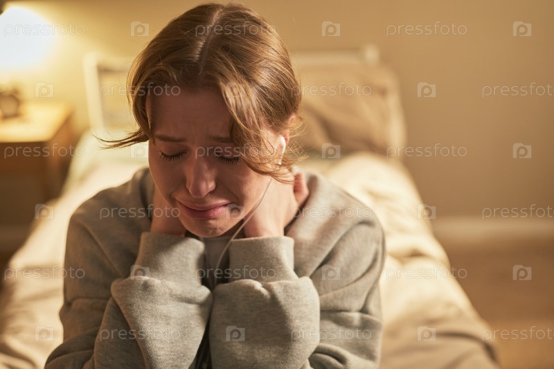 Молодая белая женщина сидит на кровати, плачет и выражает глубокую печаль