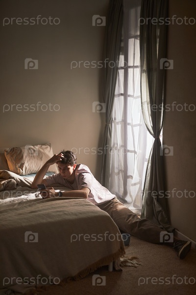 Молодой белый мужчина сидит на полу, чувствуя себя грустным во время просмотра смартфона