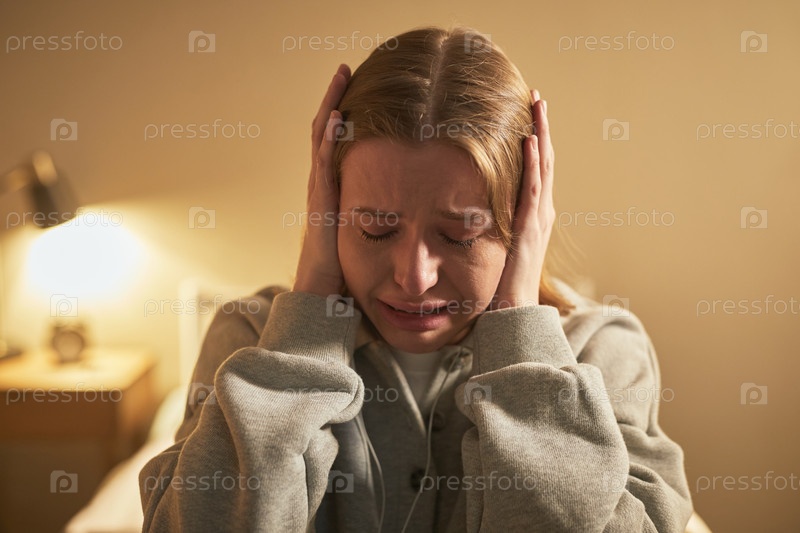 Портрет молодой взрослой белокожей женщины, плачущей и закрывающей уши в помещении